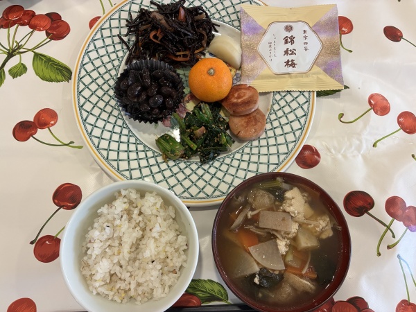 ・けんちん汁(大根、人参、ごぼう、里芋、小松菜、豆腐、油あげ、こんにゃく、エノキ、まいたけの10種類の具材入り)