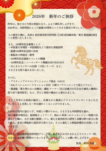 本年も、前田東洋医学研究院グループは、皆さまのお力になれるようスタッフ一同、