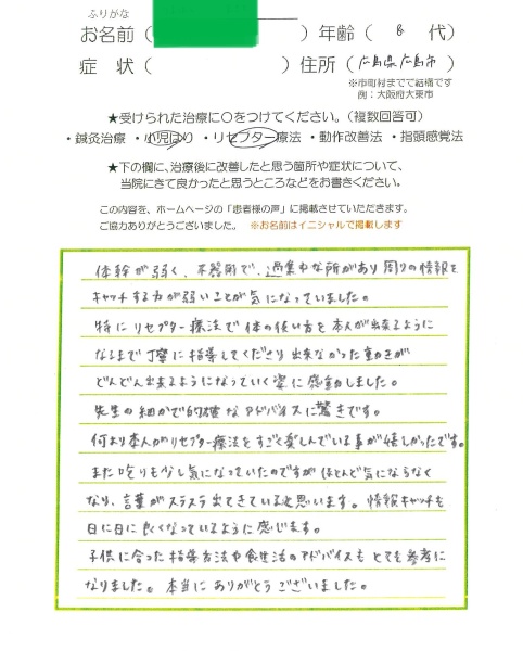 何より本人がリセプター療法をすごく楽しんでいる事が嬉しかったです。