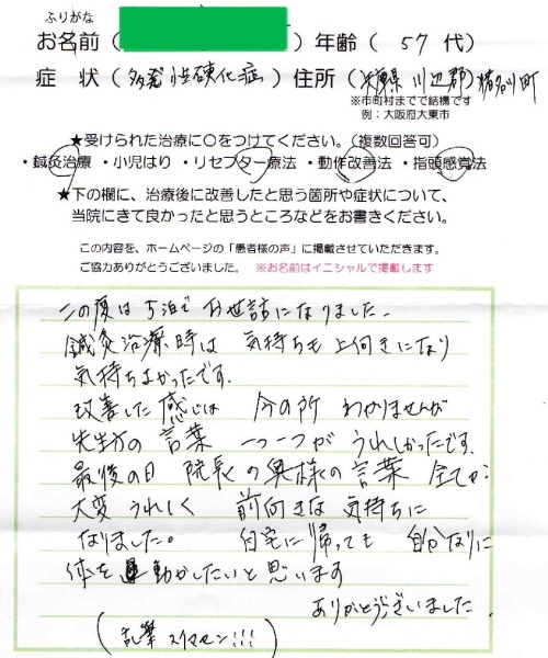 患者様の声 2026/04/13 【多発性硬化症】50代/女性 兵庫県川辺郡猪名川町 主訴:多発性硬化症 年齢:50代/女性 住所:兵庫県川辺郡猪名川町 施術内容:鍼灸治療、リセプター療法、動作改善法、指頭感覚法 この度は5泊でお世話になりました。 鍼灸治療時は気持ちも上向きになり気持ちよかったです。 改善した感じは今の所わかりませんが 先生方の言葉一つ一つがうれしかったです。 最後の日 院長の奥様の言葉 全てが大変うれしく 前向きな気持ちになりました。 自宅に帰っても自分なりに体を動かしたいと思います。 ありがとうございました。 (乱筆スイマセン!!!) « 前へ 一覧へ