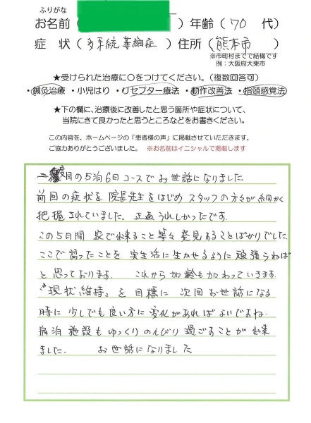 患者様の声 2024/12/03 【多系統萎縮症(MSA)】70代/男性 熊本県 主訴:多系統萎縮症(MSA) 年齢:70代/男性 住所:熊本県 施術内容:鍼灸治療、リセプター療法、動作改善法、指頭感覚法 二度目の5泊6日コースでお世話になりました。 前回の症状を、院長先生をはじめスタッフの方々が細かく把握されていました。 正直うれしかったです。 この5日間 家で出来ること等々 発見することばかりでした。 ここで習ったことを、実生活に生かせるように頑張らねばと思っております。 これから加齢も加わっていきます。 ”現状維持”を目標に 次回お世話になる時に 少しでも良い方に変化があればよいですね。 宿泊施設もゆっくりのんびり過ごす事が出来ました。 お世話になりました。 « 前へ 一覧へ 次へ »