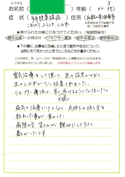 患者様の声 2025/10/17 【多系統萎縮症(MSA)】60代/女性 和歌山県海南市 主訴:多系統萎縮症(MSA) 年齢:60代/女性 住所:和歌山県海南市 施術内容:鍼灸治療、リセプター療法、動作改善法、指頭感覚法 電気治療をして頂いて、足の指先が伸びて、 足のしびれが少し改善されました。 リセプター療法、早く大股で歩けるようになりました。 病気の治療だけでなく、気持ちの持ち方を教わった事が、良かった。 病院の方皆さんが親切にして下さり、嬉しかったです。 « 前へ 一覧へ 次へ »