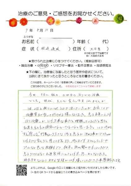 息子自身にとっても「はり治療」がとても大事な事だと