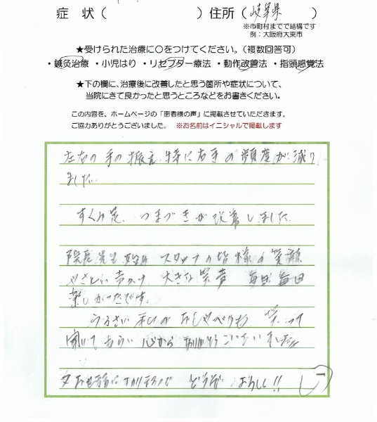 患者様の声 2024/06/13 【進行性核上性麻痺(PSP)】70代/女性 岐阜県より 主訴:進行性核上性麻痺(PSP) 年齢:70代/女性 住所:岐阜県 治療内容:鍼灸治療、リセプター療法、動作改善法、指頭感覚法、温熱療法 左右の手の振え、特に右手の頻度が減りました。 すくみ足、つまづきが改善しました。 院長先生始め、スタッフの皆様の笑顔 やさしい声かけ、大きな笑い声、 毎日毎日楽しかったです。 うるさい私のおしゃべりにも笑って聞いてもらい 心からありがとうございました。 又お世話になりますので、どうぞよろしく!! « 前へ 一覧へ 次へ »