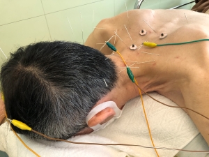 ①当院独自開発した【新脳針】施術法:頭部にある運動区(四神総という奇穴エリア)を中心に身体の緊張している箇所や緊張反射に伴うエリアに刺鍼します。